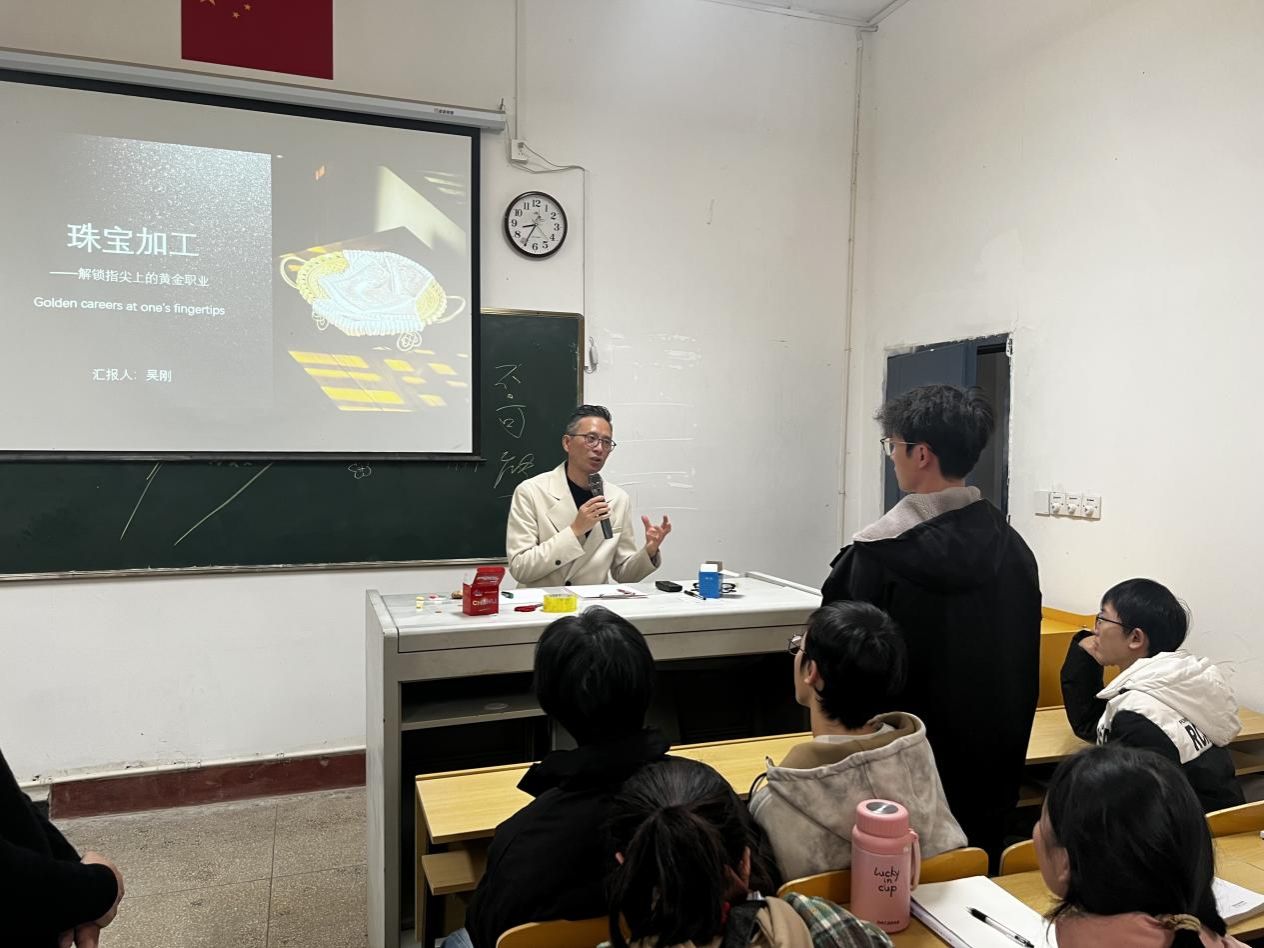 互动交流环节中,学生们围绕专业学习、技能提升、就业创业、工艺创新等话题踊跃提问。吴刚结合行业实际与人才成长规律逐一解答,并鼓励学生夯实基础、大胆创新,将传统技艺与时代审美相结合。在场师生纷纷表示,这场讲座干货满满,不仅拓宽了专业视野,更深刻体会到了珠宝匠人精益求精的工匠精神。